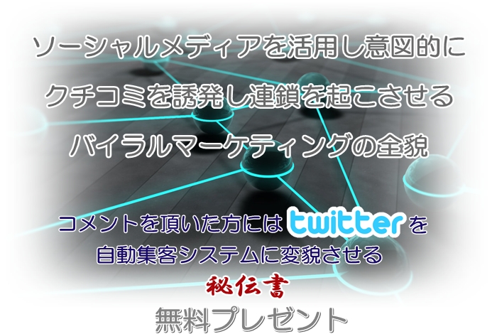 まずは、こちらの動画をご覧下さい。 ブログでも海外のソーシャルメディア活用実例を紹介しております。 ![]() ![]() ソーシャルバブルの崩壊☆ノウハウだけでは生き残れない時代の到来!! これから生き残る為のキーワードは”シェア”です。 下記コメント欄に動画の感想、もしくは今後の期待をお書き下さい。 例)ソーシャルメディアについて詳しく知りたい。 例)具体的な活用法を知りたい。 >>>次の動画ではゼロから最短で富を築く方程式を解説致します。 ツイッター自動ツール【無料版】&【秘伝書】日本語翻訳マニュアルプレゼント ![]()